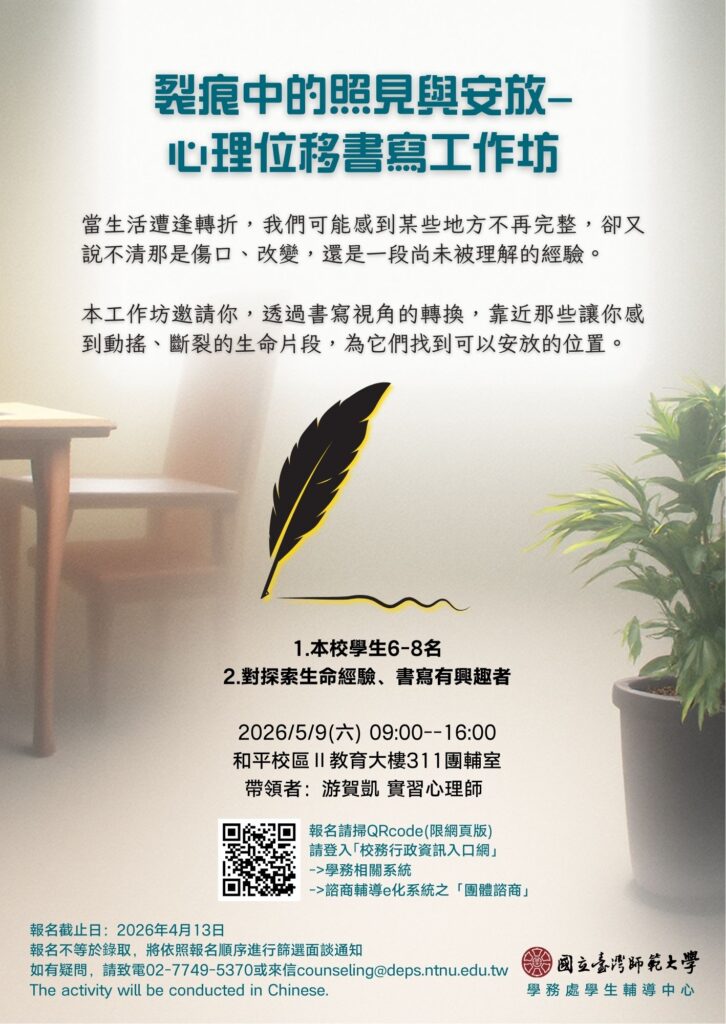 | ◆ 帶領者:游賀凱 實習心理師 ◆ 時間:民國115年5月9日(六),09:00-16:00 ◆ 地點:和平校區II教育大樓311團輔室 ◆ 對象: 1. 本校學生6-8名。 2. 對探索生命經驗、書寫有興趣者。 ◆ 報名截止日期:115年4月13日(報名不等於錄取,將依照報名順序進行篩選面談) |